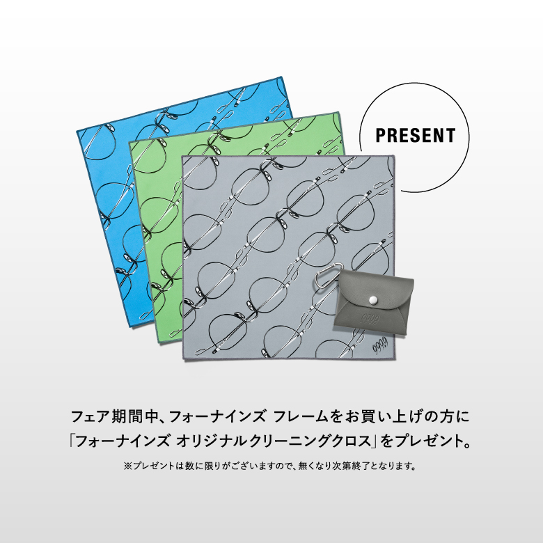 また、フェア期間中にフォーナインズのアイウェアをご購入のお客様へ先着で、オリジナルノベルティのメガネ拭きを1枚プレゼントいたします。