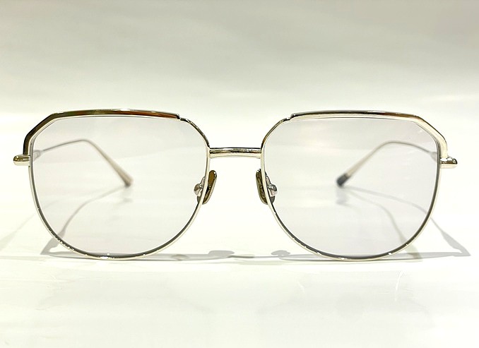 ヴィンテージ感のある少し大きめのレンズシェイプながら、上リム途中まで付いた眉のようなブローパーツ等により現代的なデザイン