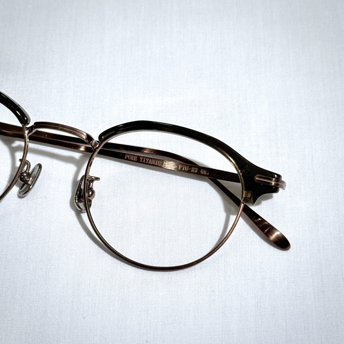 濃いグリーンのアセテートにIPメッキのブラウンを組み合わせは、