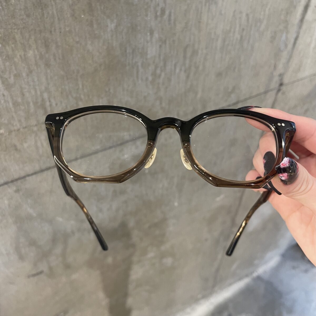 抜け感のあるオリーブグラデーションで、黒やべっ甲だとありきたりだな…