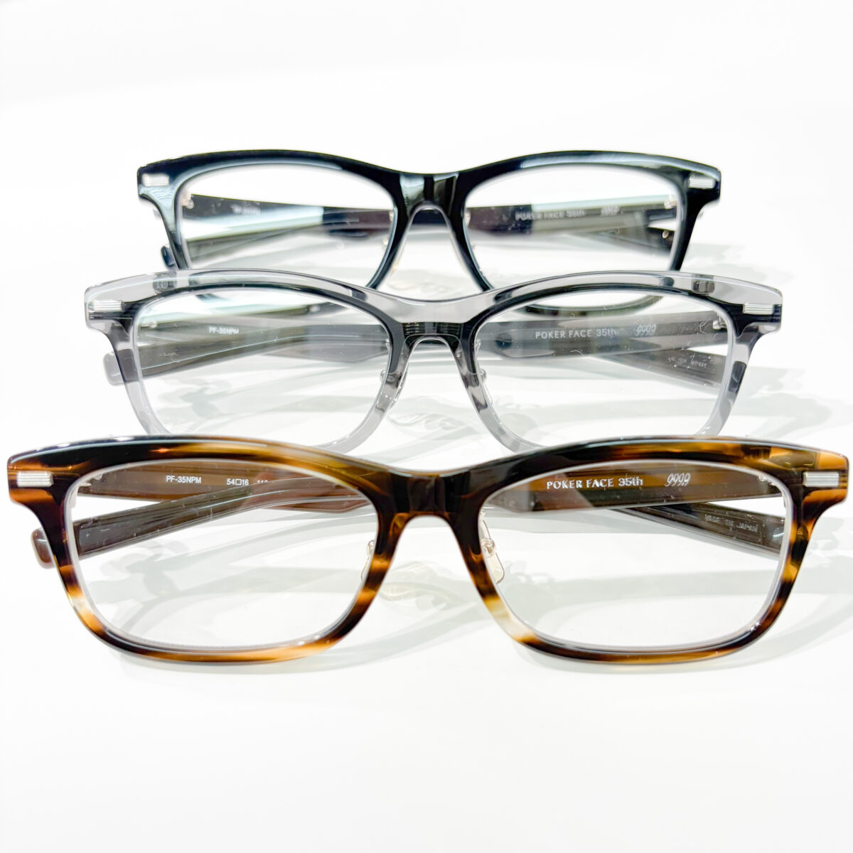 999.9フレームの中でも高い人気を誇る“跳ね上げシリーズ”を、POKER FACEで支持の高いシェイプで新たに構築。既存ラインとはまた異なる魅力のある特別な跳ね上げスタイルが完成しました。