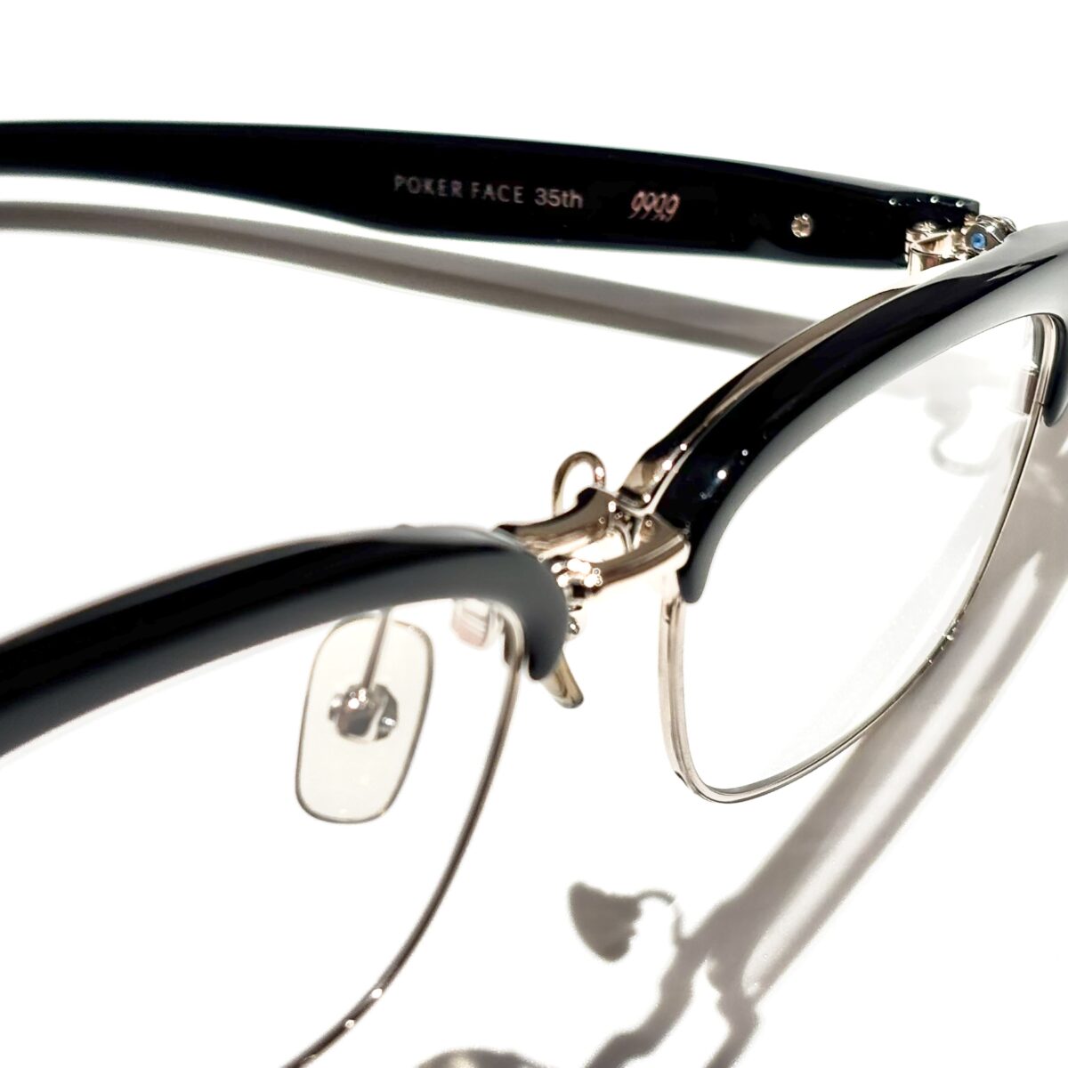 日本の眼鏡づくりを牽引してきた999.9。精巧な構造と快適な掛け心地を追求する姿勢は、常にアイウェアの理想を示してきました。POKER FACE 35周年を記念した特別モデルでは、その機能美に普遍的で洗練されたデザインを融合。999.9フレームの中でも高い人気を誇る“跳ね上げシリーズ”を、POKER FACEで支持の高いシェイプで新たに構築。既存ラインとはまた異なる魅力のある特別な跳ね上げスタイルが完成しました。