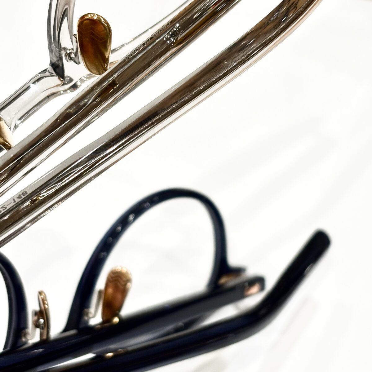カシメ飾りに使用する金属パーツに合わせて、丁番、チタンノーズパッド、ブランドロゴまでを同じカラーに仕上げています。アセテート生地と金属のカラーリングによる多彩な組み合わせはMAINの魅力のひとつ。