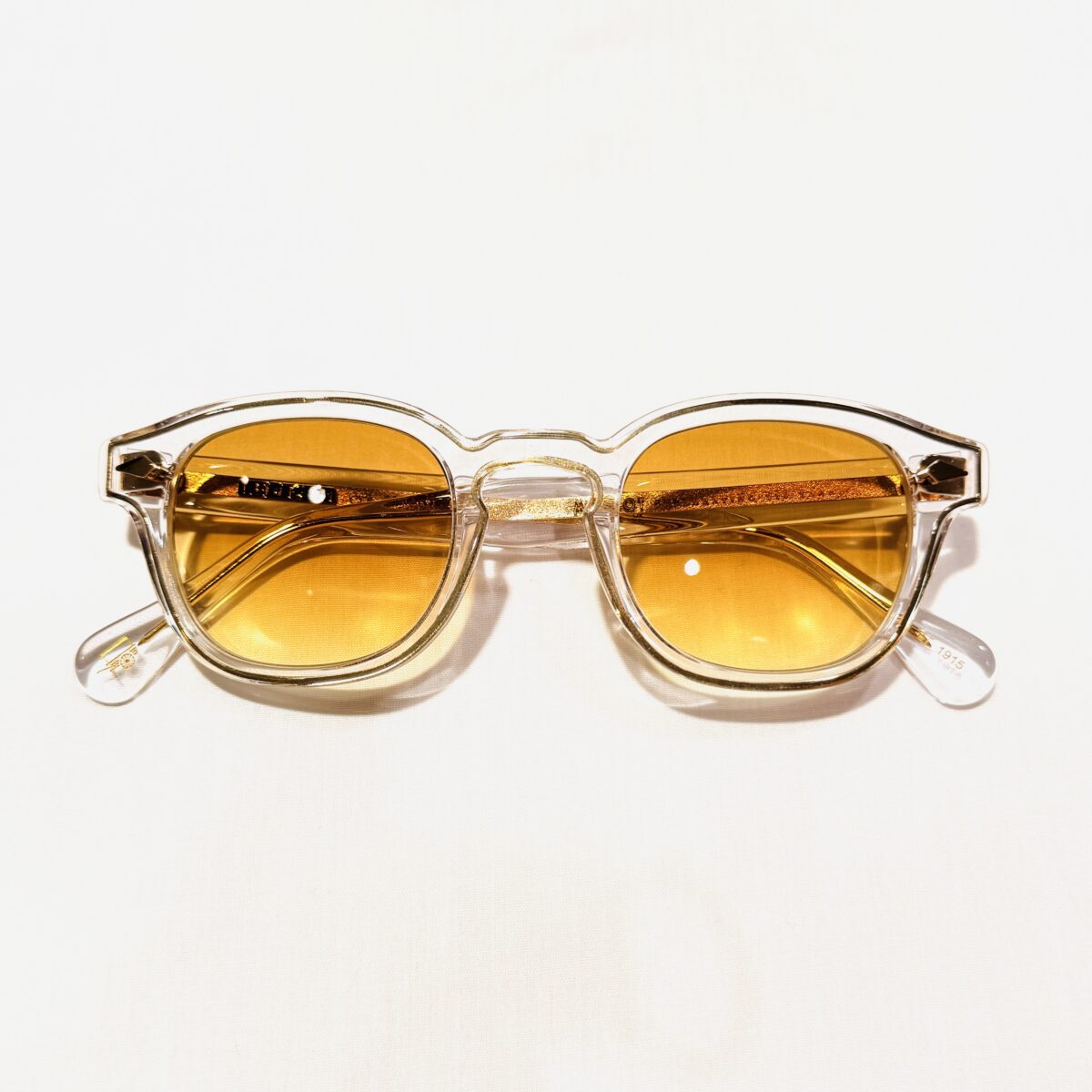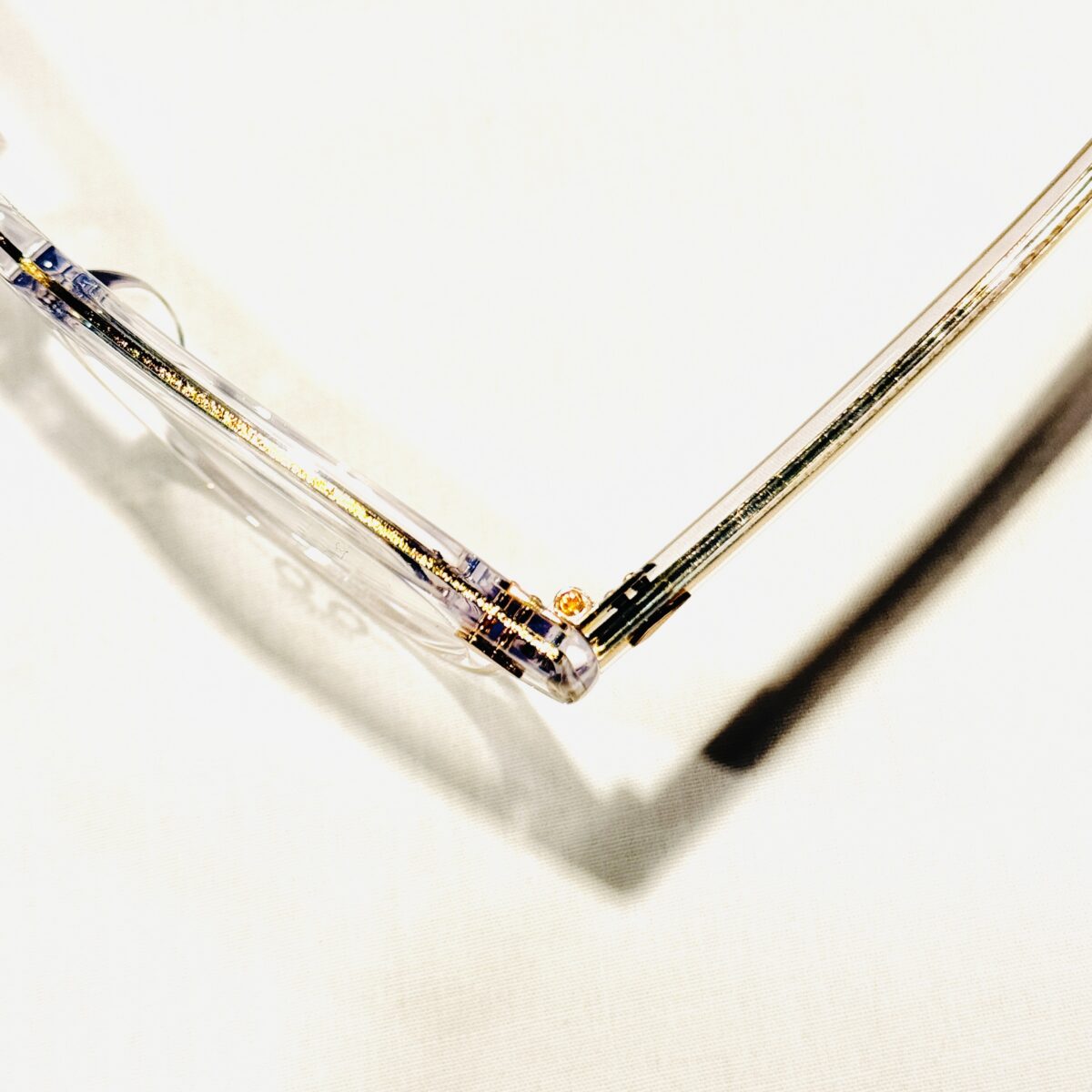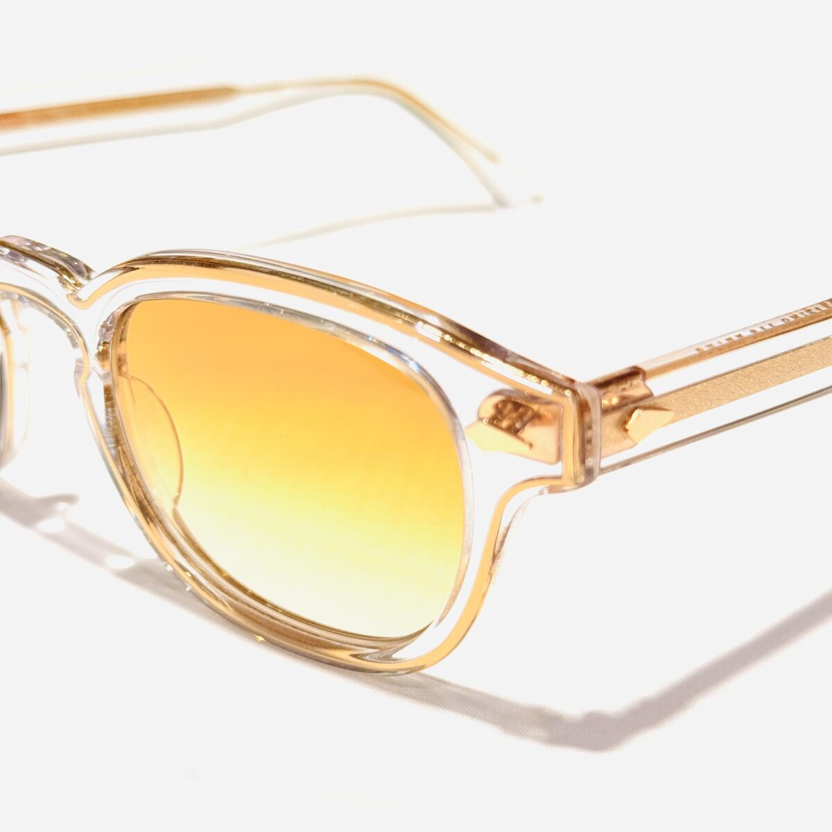 テンプルの芯金・シルク印字・リベットもゴールドで統一され、