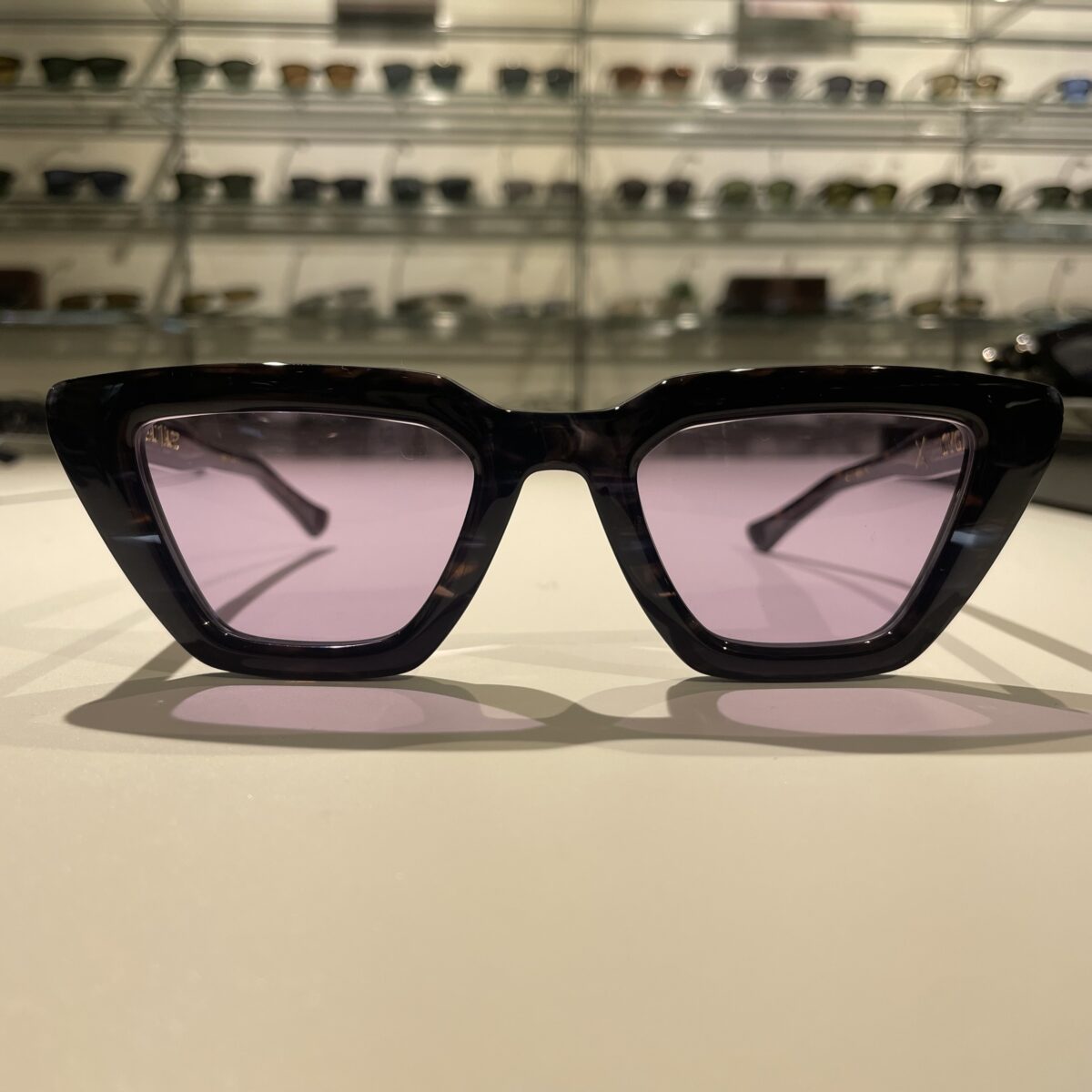 大きな四角いフレームの中と丸みのあるレンズの組み合わせがポイントのモデルです。