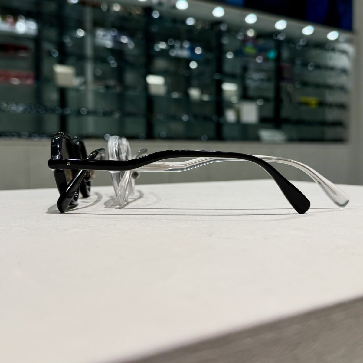 高いブリッジと低い智、合口部からしのみにかけて徐々に位置が上がっていく アンダーテンプルという特徴的デザインのセルフレームです。