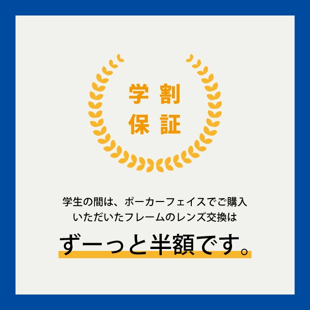 成長期で度数がすぐ変わってしまうかも。。など大人よりも心配事が多い学生さんが安心してメガネをお使いいただくために、学生の間は、ポーカーフェイスでご購入いただいたフレームのレンズ交換はずーっと半額です。