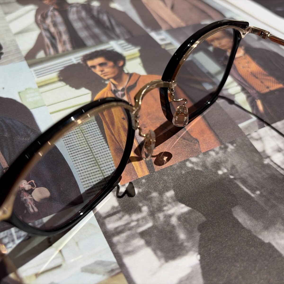 2023SSシーズンモデル【Danforth】のサイズアップバージョンとなっております。ウェリントン型のプラスチックリムに熟練の職人技でロウ付けをせず成形されたミル模様入りの一体型トップバーを組み合わせています。