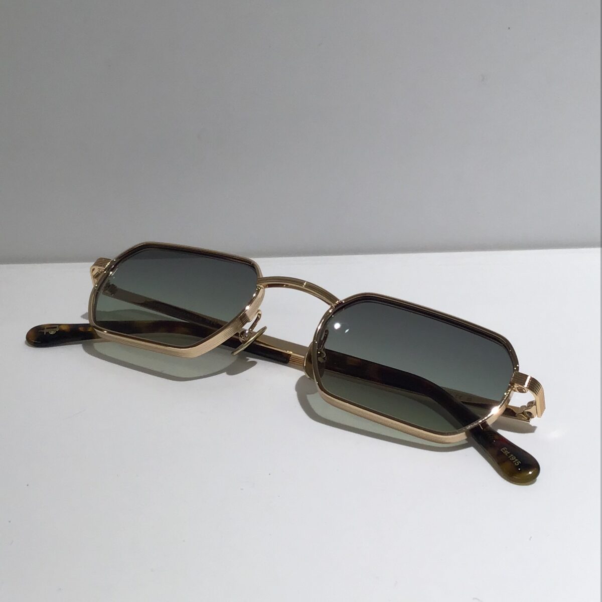 こちらの色味は緑のレンズ、テンプルはさりげなくべっ甲柄になっていて可愛いです。