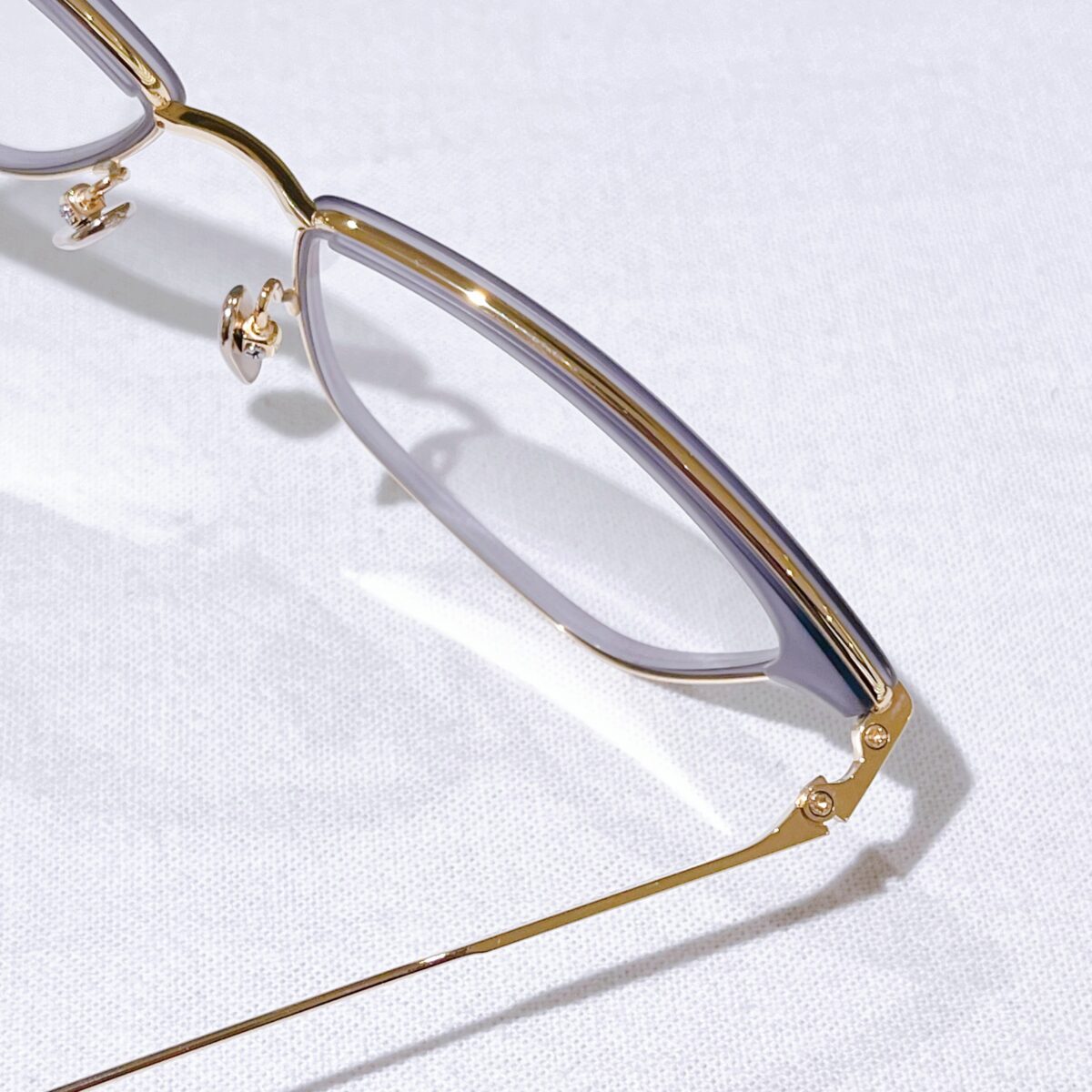 #24 GRY/GPは透け感のあるマットグレーとゴールドの組み合わせ。エレガントなキャッツアイフレームに仕上がりました。