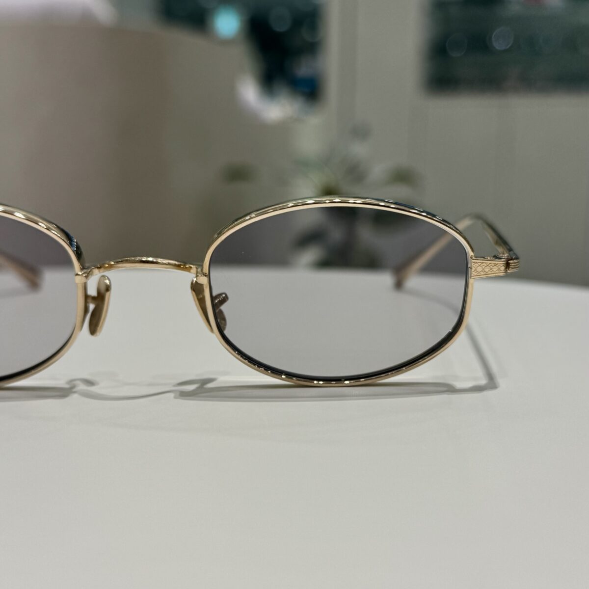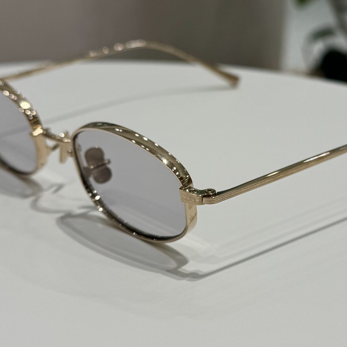 わずかに厚みを持たせたEYEVANオリジナルリムに、丁番の内側まで彫刻を施した職人によるヨロイ、繊細な模様を刻んだチタンテンプルを組み合わせ、柔らかな曲線を描くブリッジには新たに型から起こしたトップバーを合わせています。