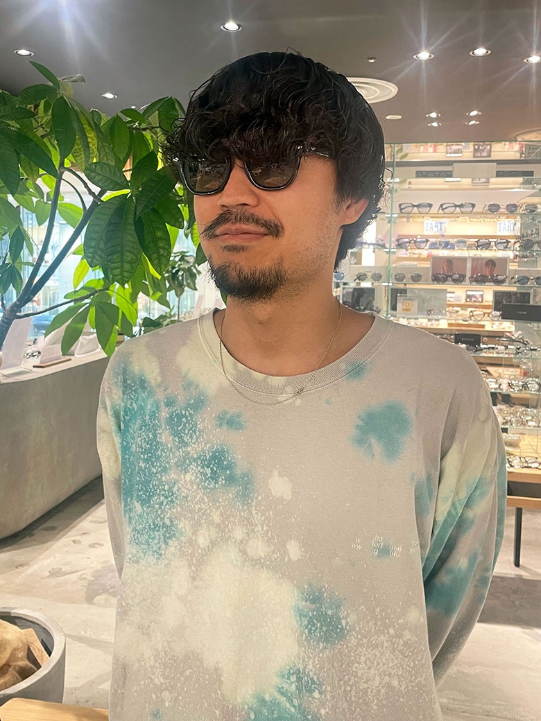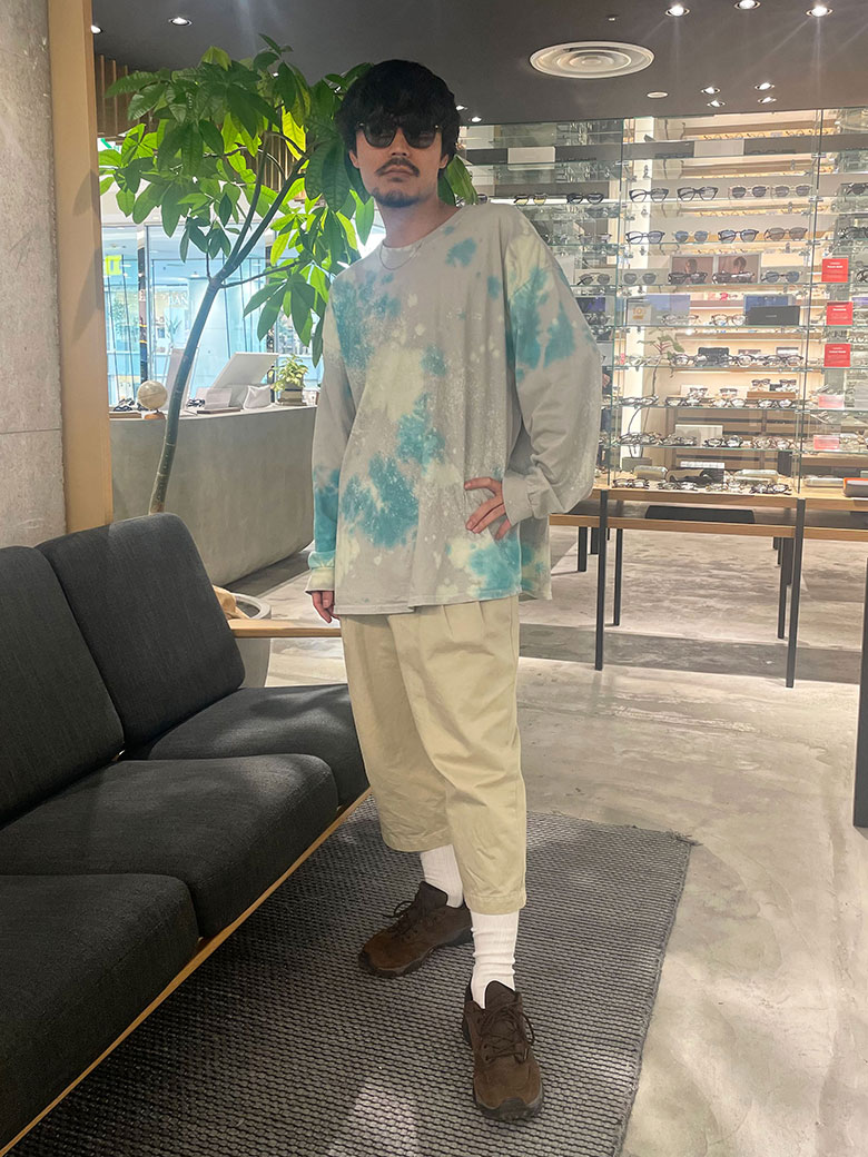 爽やかなカラーのコーディネートのため、印象が重たくなりすぎないダークグリーンカラーのサングラスで色合わせをしました。明るめのカラーのスタイルで、黒だとハマらない…という方に特におすすめです。