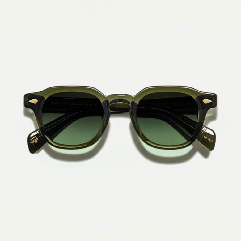 爽やかなカラーを引き立てる、ダークグリーンのサングラス。
