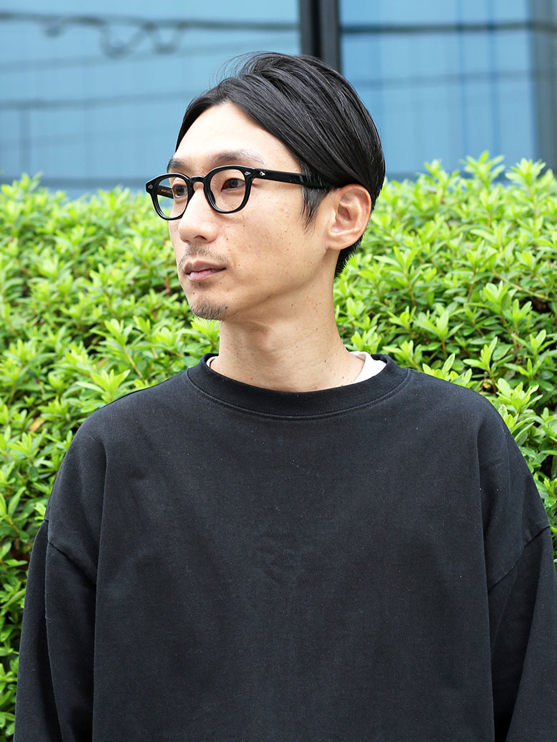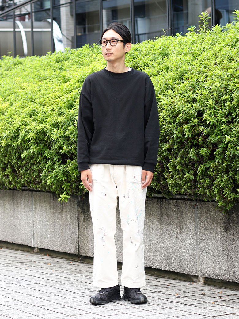 ペイントパンツに黒ぶちフレームで魅せる大人カジュアル。