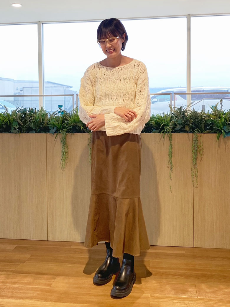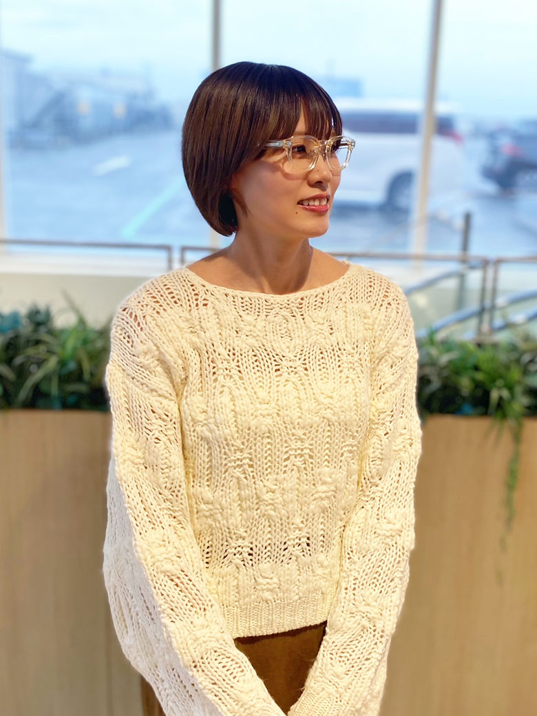ゆったりとしたニットに、軽やかなクリアフレームを合わせました。