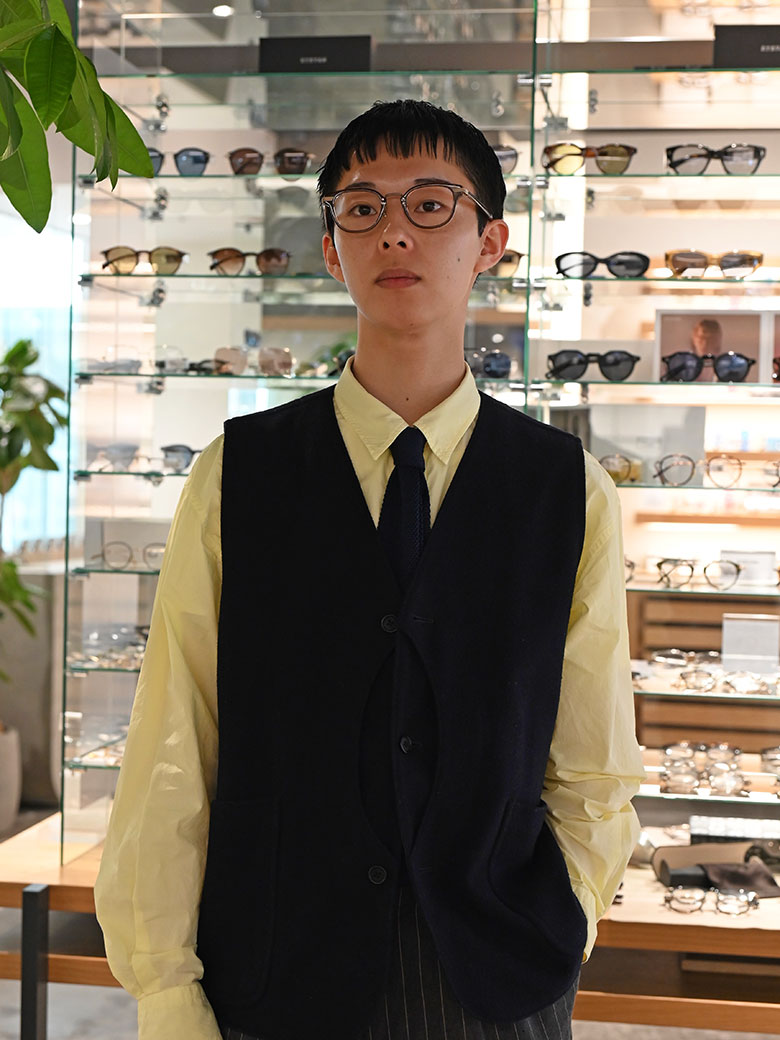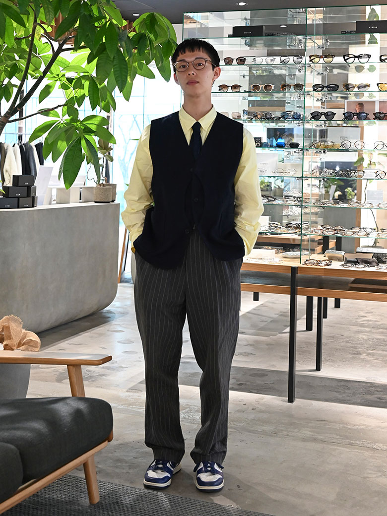 スニーカーで外すように。眼鏡にも抜け感を意識し、クラシックなフレームのつくりでありながら、裏にクリアの生地を張り合わせたこちらのカラーがコーディネートに抜け感を与えくれ、クラシックに「なりすぎず」掛けられる好バランス。是非店頭にてお試しください。