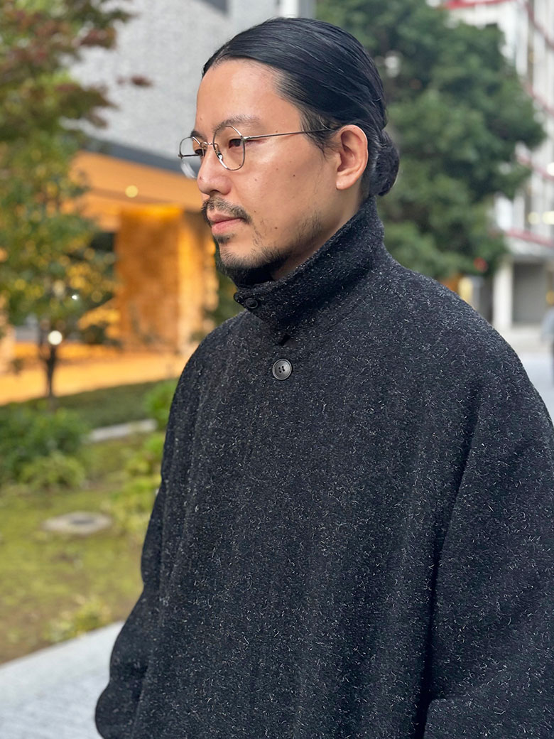 【POKER FACE35周年モデル】オーバーサイズコートに合わせる華奢なメタルフレーム。