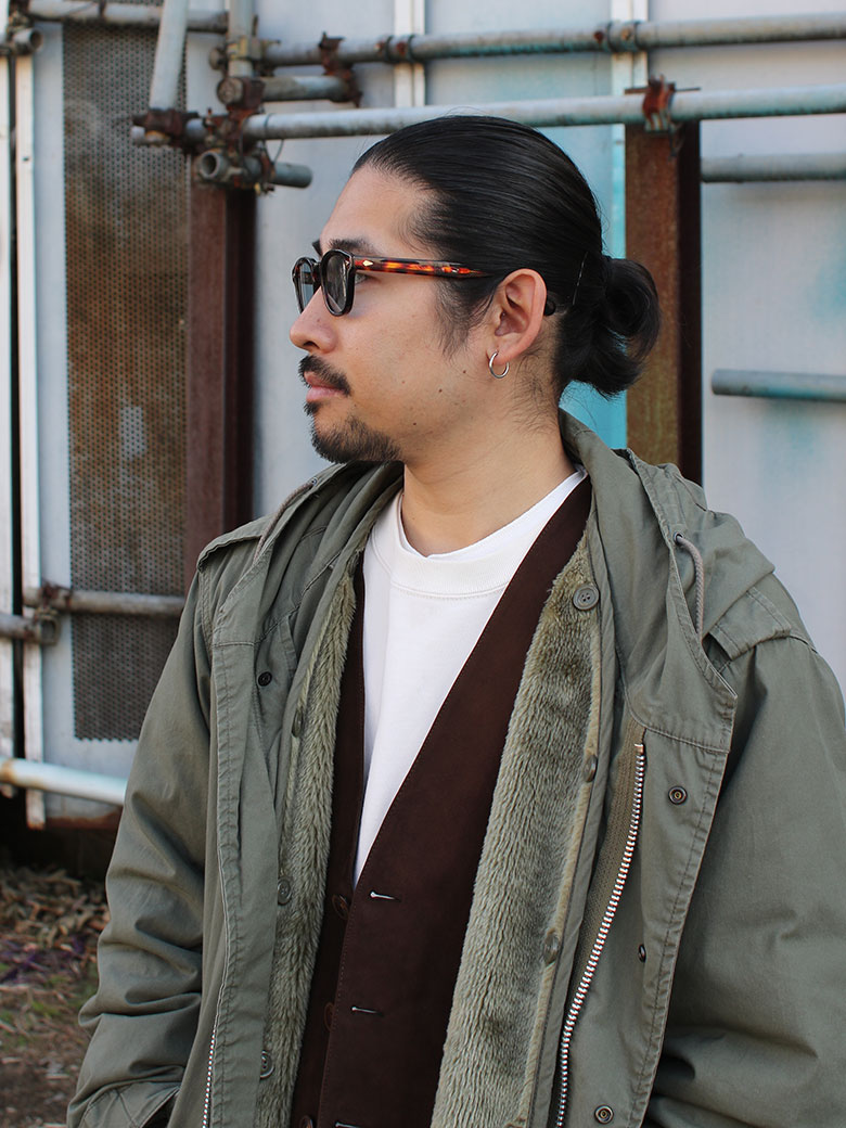 深めのべっ甲柄フレーム×ブルーレンズも、カジュアルながらクールな印象を出すことが出来る相性バッチリの組み合わせ。黒縁だとなんかきつく見える、重たくなってしまうと感じている方は是非お試しください!