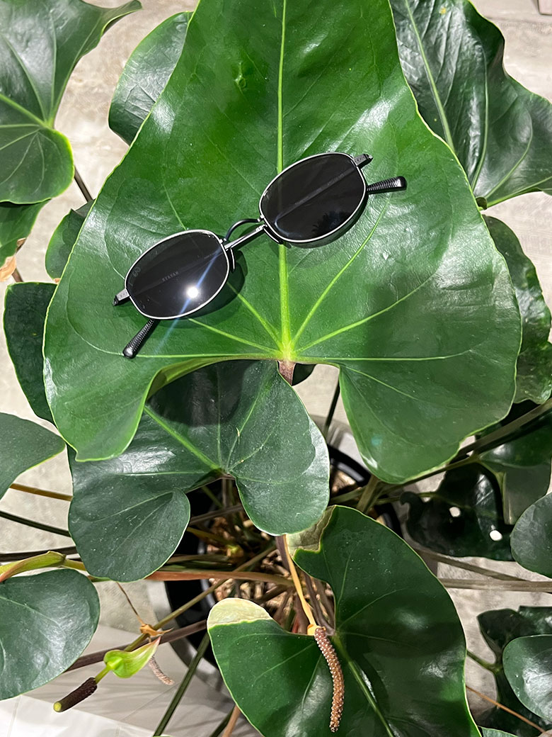 今回チョイスしたのはマットブラック。メタルですが、重厚感を演出してくれます。スタイリングのポイントは、全身ブラックだと重くなりすぎるかなと思い、淡い差し色を取り入れました。