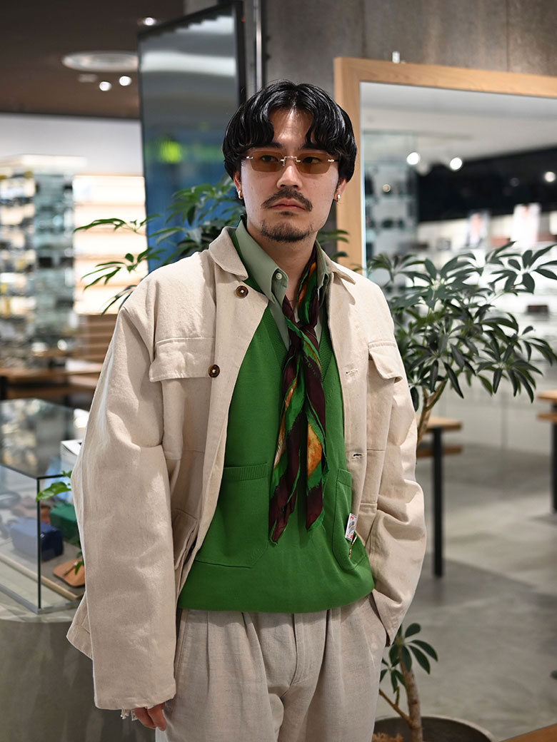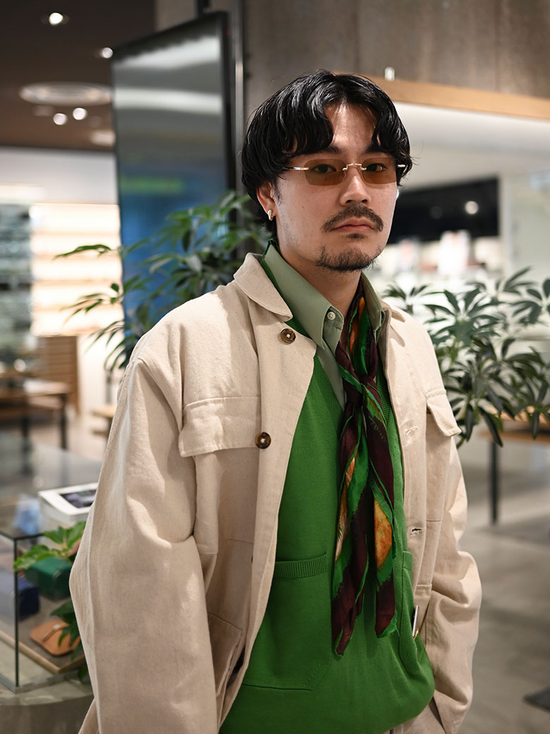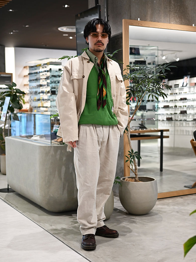 普段はセルフレームをよく手に取ってしまいますが、しっかりと雰囲気の出るリムレスというのはさわやかなコーディネートになじみながらも、アクセサリーのように気分を上げてくれ、コーデの実は核にもなっています。