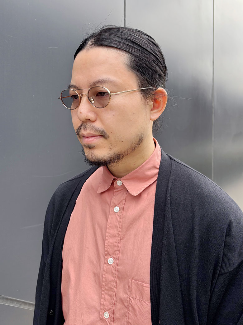洋服がシンプルな分、サングラスはトレンド感のあるオーバル型にダブルブリッジを合わせた個性的で攻めた印象にしました。