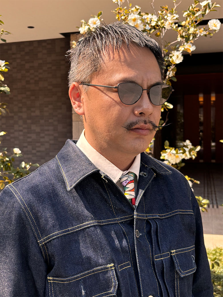 デニムジャケットをスラックスとシャツできれいに合わせてみました。この装いにただのセルフレームだと無難にまとまり過ぎてしまうので、あえて攻撃的なFOXシェイプをセレクト。