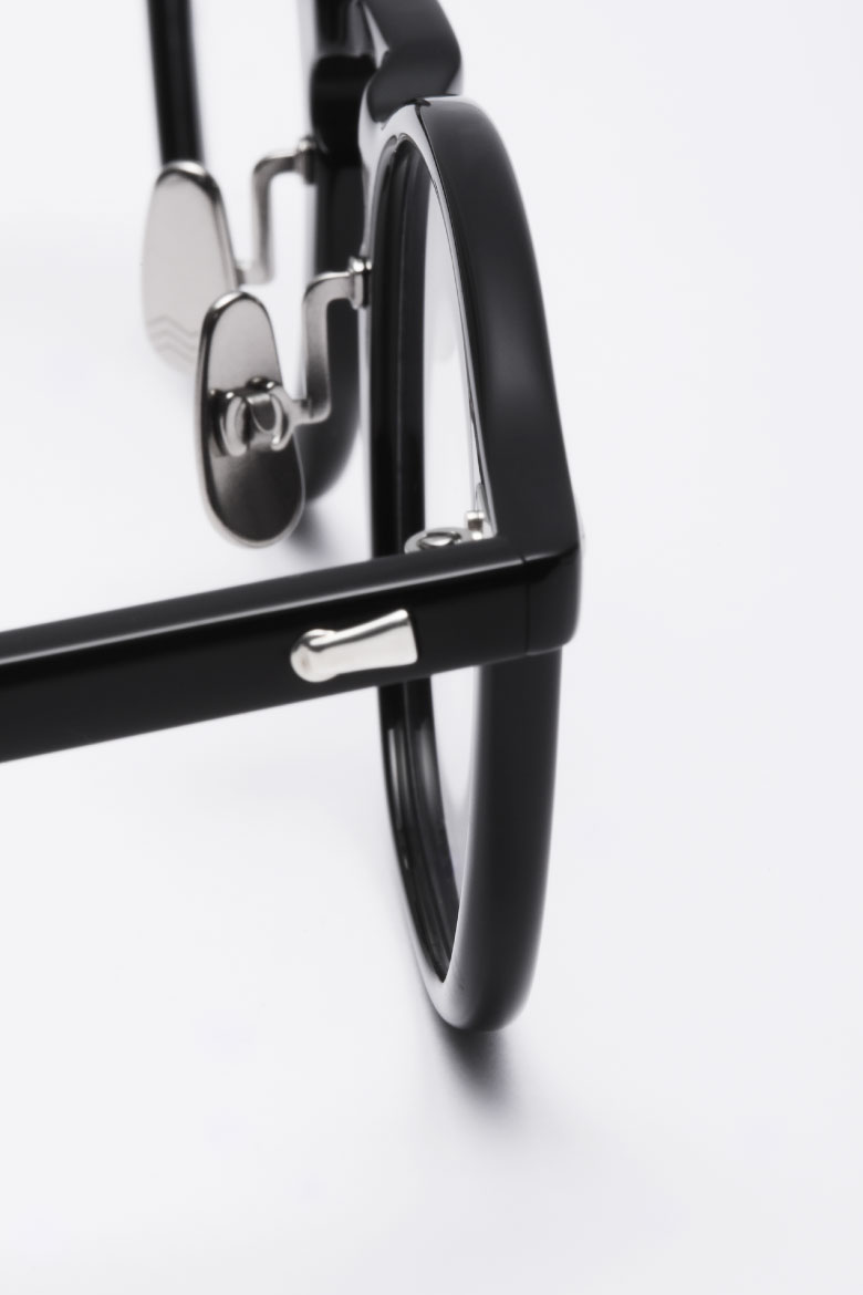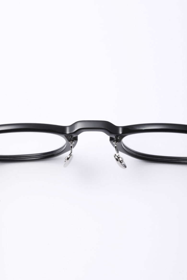 1950年代にアメリカのマイナーブランドが製造したフレームをベースに、リムラインを極限まで細く仕上げた。外径と内径を異なるラインで描くことで独自のバランスを追求し、柔らかさとシャープさが共存する普遍的な玉型が完成した。合口幅を5mmに設定し、先端に向かって広がる形状をしたオリジナルテンプルと合わさることで、静かながら存在感のある佇まいとなった。