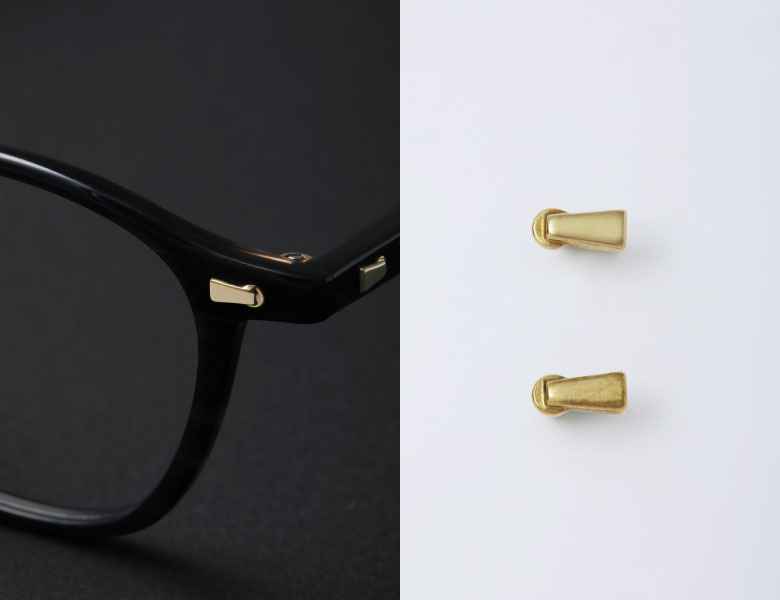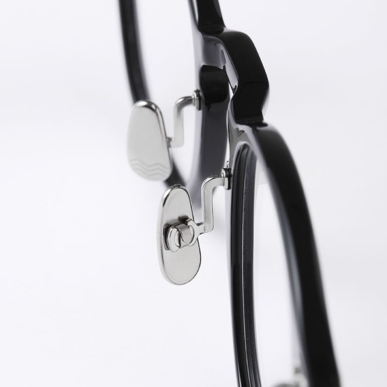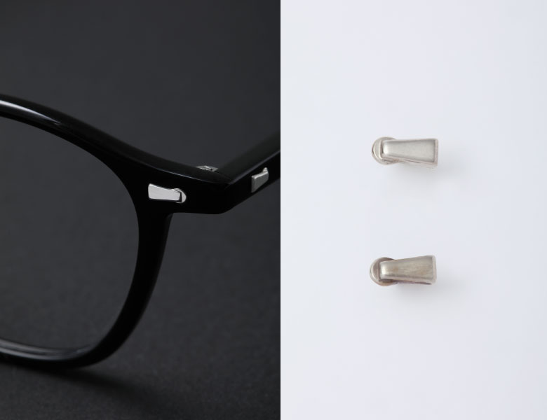 ブランドが独自で考案した「Reverse hold」構造を用いたオリジナルクリングスノーズパッド。1950年代ごろ誕生した通称「抱き蝶」とよばれる抱き込み式のパッド構造を改良したもの。一般的なクリングスでは「ボックス型」と呼ばれるネジ留めの構造が主流だが、ネジが緩み、外れるという事象がしばしば発生する。抱き蝶はクラシックなディティールながら、ネジを用いないため見た目もシンプルで美しいディティールです。