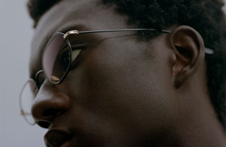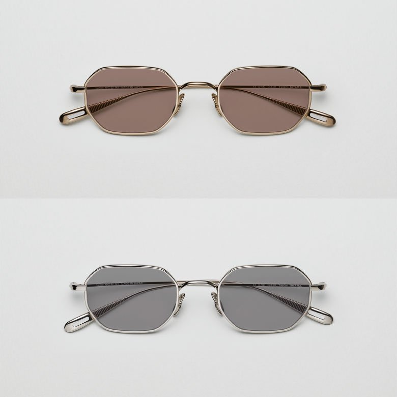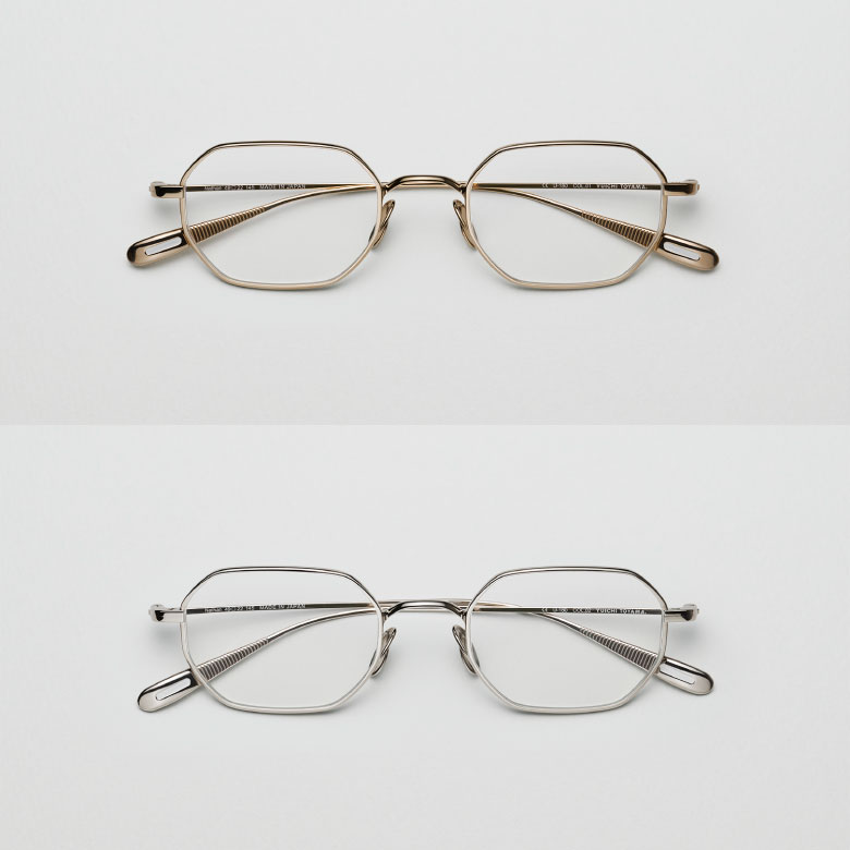 ビンテージフレームに見られるオクタゴンシェイプをベースに立体的なプレスを施したシートメタルフレーム。フロントからヨロイ、テンプルへと繋がる丸みと平面の組み合わせはチタン素材の持つ表情を引き出し、自然と顔に馴染む造形美を表現しています。