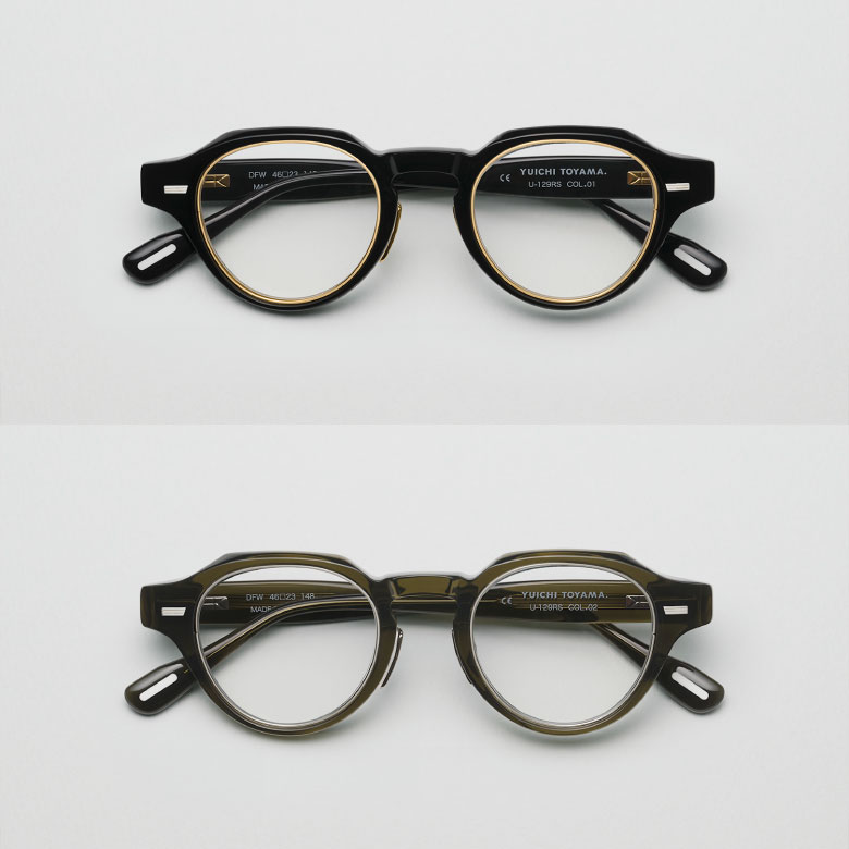 2020年の発表以来、YUICHI TOYAMA.の定番モデルとして支持されてきた「U-129 / DFW」のリニューアルスペック。ヨロイにボリュームを持たせたクラインパントフレームは、角を持たせたブロウラインにシャープなカッティングを施し引き締まった印象のデザインです。メタルインナーリムやオリジナル丁番など、随所にYUICHI TOYAMA.らしいディテールを施しています。