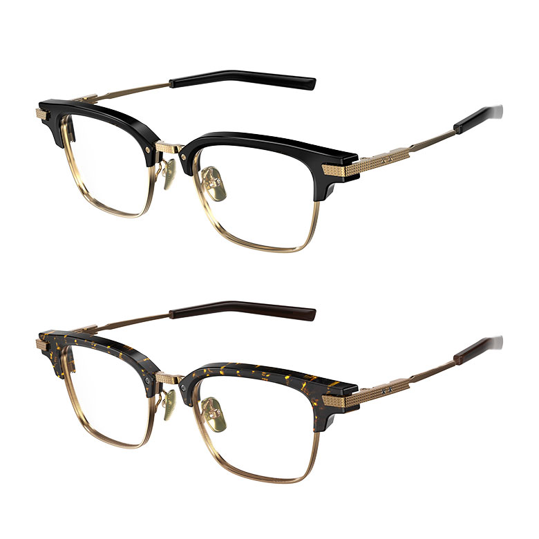 フォーナインズのハイエンドラインより「M-01H」が入荷。8mm厚の生地から作られたプラスチックブロウにテレビジョンカットを施し立体感を演出。ブリッジとテンプルにはハイエンドラインのアイコンとなるブロックパターンを施しています。