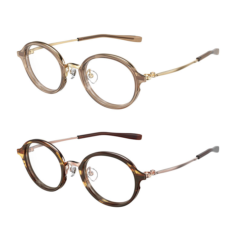 華やかな色合いのプラスチックリムと、凛とした表情のメタルテンプルが美しく調和したレディースモデル。装飾を控えめにしたミニマルなスタイルが、フレームとしての完成度の高さを際立たせ、軽やかさと高い質感を併せ持ちます。日常に快適さと彩りを添えるミックスフレームです。