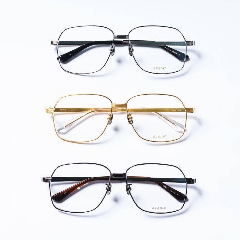 ビッグシルエットでありながら、フレームはチタン素材、ノーズパッドにはayameオリジナルのチタンパッドを採用した最適なセットアップが存在感と軽い掛け心地を同時に成立させました。ゴールドフレームには本モデルのために特別に製作されたゴールドメッキ仕様のノーズパッドを採用。細部まで統一感が追求されています。