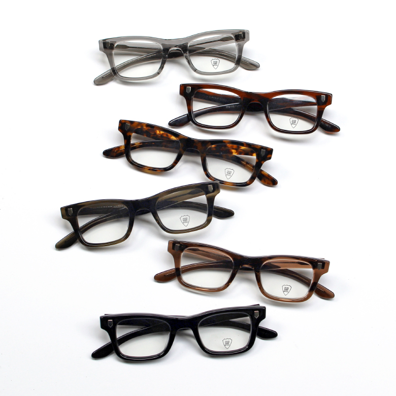 滑らかでやや丸みを持たせつつ、シャープな印象でかけられるウェリントン型のモデル。外側のリムラインは15度の角度で内側に向かって下がっており、非常に洗練されたライン。弾丸をモチーフとしたフロントのリベットが特徴的です。